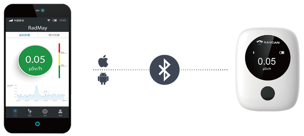 RadTarge-Mini 用戶可以通過藍(lán)牙連接RadMay,建立終身可追溯的個(gè)人輻射劑量健康檔案,為個(gè)性化醫(yī)療提供翔實(shí)可靠的數(shù)據(jù)支持。同時(shí)結(jié)合移動(dòng)終端的全球定位系統(tǒng)(GPS)可實(shí)現(xiàn)精準(zhǔn)的時(shí)間、位置、劑量率三位一體的劑量測(cè)量,繪制全球輻射強(qiáng)度軌跡和分布情況。